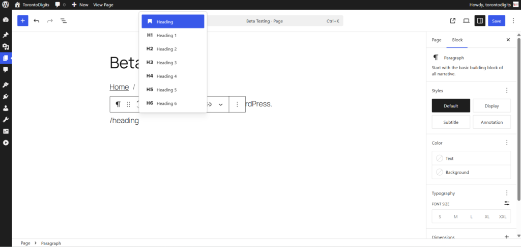 Now, each heading level is available as its own block variation. You can choose H1, H2, H3, and so on directly from the block inserter before you start typing.