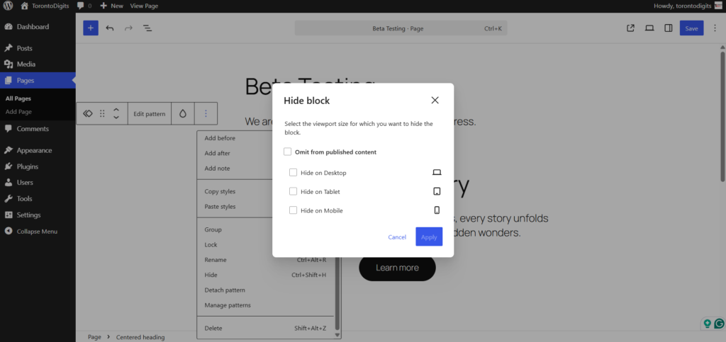 - Responsive Editing Mode – Show or hide specific blocks depending on device size, with built-in visual previews.